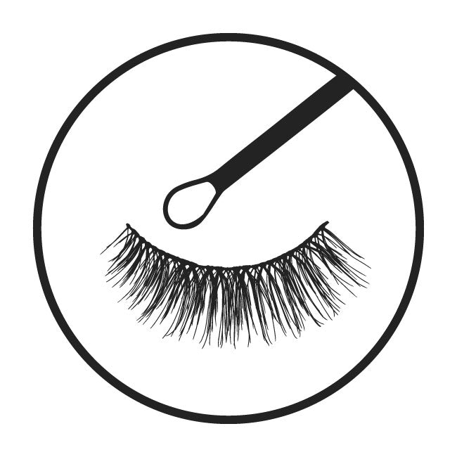 Apply a small amount of adhesive along the base of false eyelash using the brush attached on the adhesive cap.